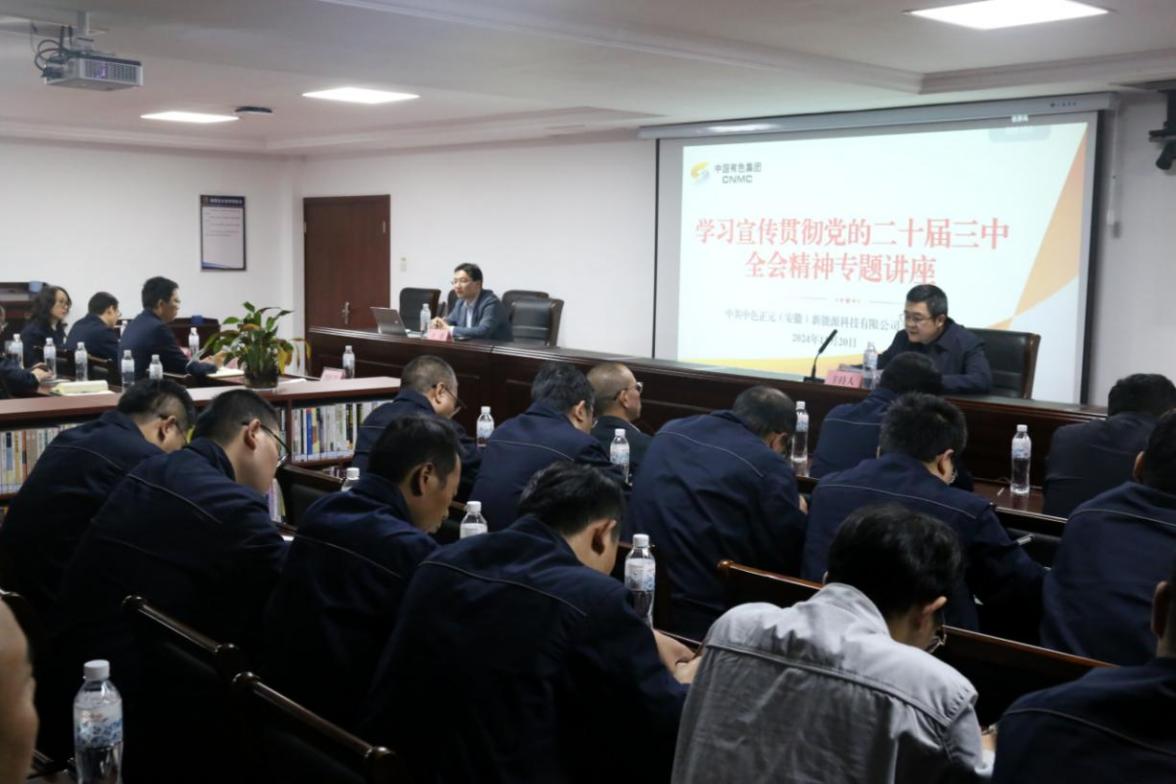 为深入学习宣传贯彻党的二十届三中全会精神,,,,,,,准确掌握全会精神实质和富厚内在,,,,,,,推动各项贯彻落实事情走深走实,,,,,,,11月20日,,,,,,,中国有色集团出资企业中色正元(安徽)新能源科技有限公司(简称:中色正元)党委约请中共中央党校(国家行政学院)法学博士、中共安徽省委党校(安徽行政学院)副教授于德作专题向导讲座。。。。。。。。