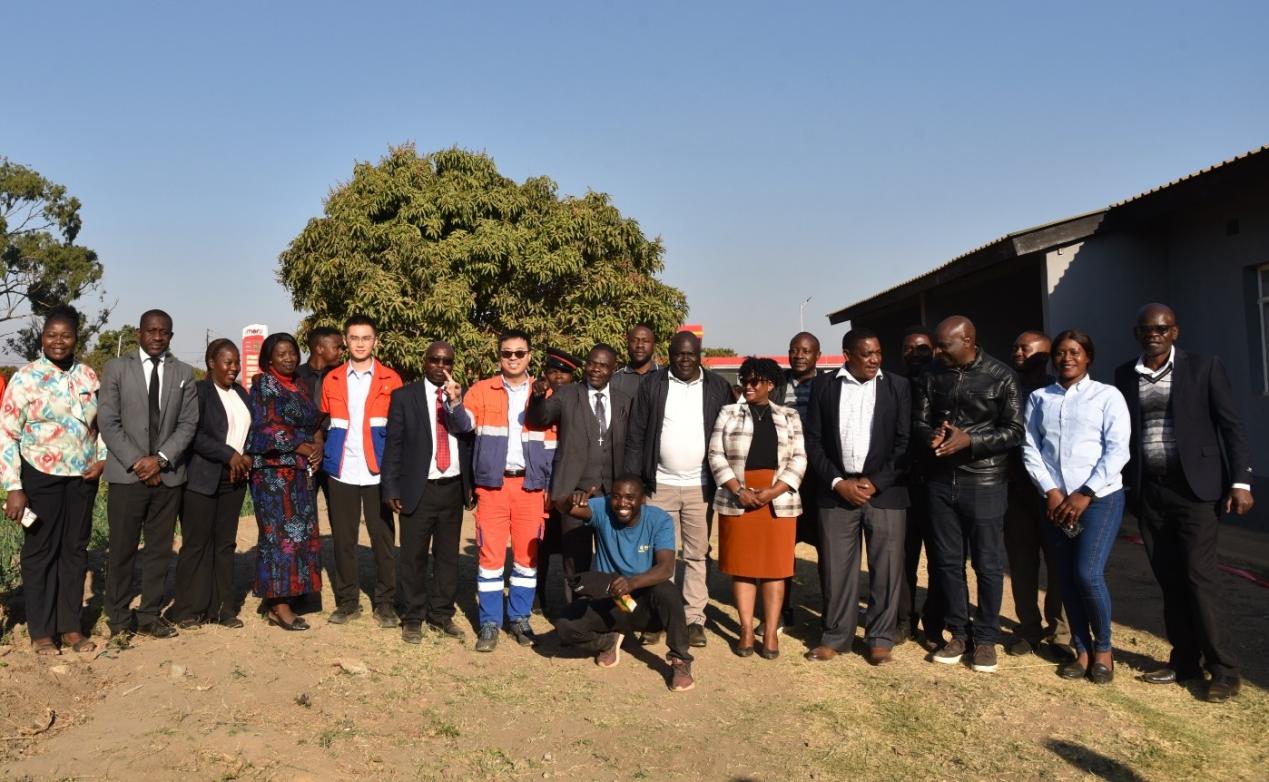 Chinese and Zambian participants pose for a group photo at the handover ceremony for several corporate social responsibility (CSR) projects implemented by Chambishi Copper Smelter Limited (CCS), a holding subsidiary of China Nonferrous Metal Mining (Group) Co., Ltd. (CNMC), in Lubuto ward, Kalulushi District, Copperbelt Province, Zambia.
